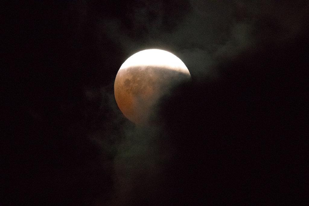 Shortly after the end of totality, the moon is about to slip behind the clouds once again