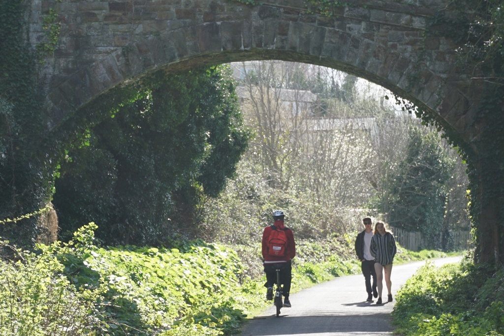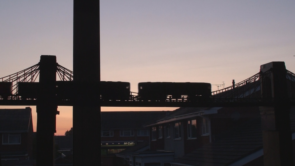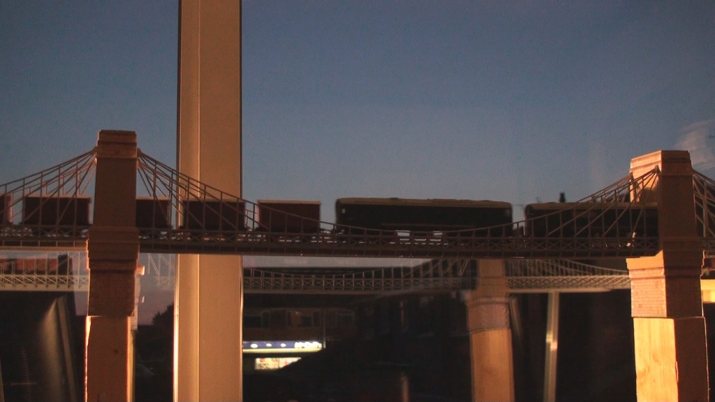 The approach to the suspension bridge, which is floodlit at night, to give the neighbours something to snigger at. The track alignment has since been improved.