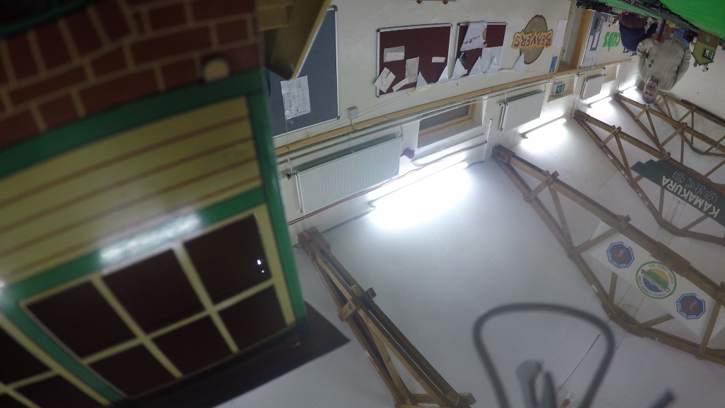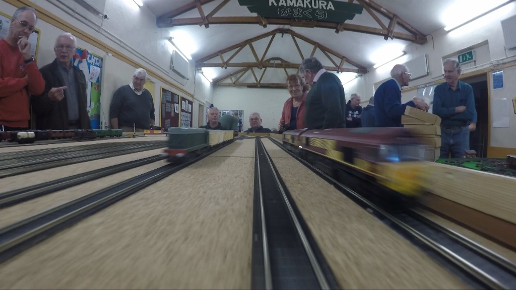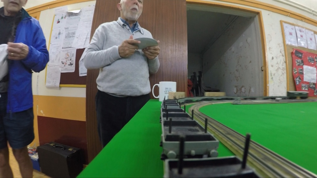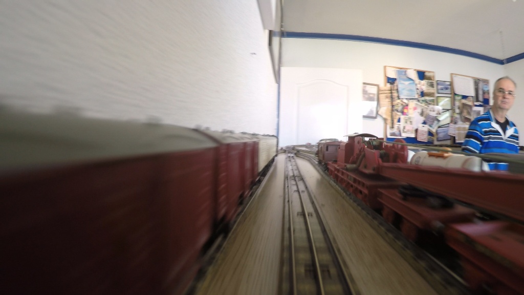 In late 2018 Chris joined the Hornby Railway Collector's Association, the Bristol & Somerset chapter of which meets once a month at a Scout Hut in Weston-Super-Mare in order to, let's not beat about the bush here, play trains. Aged below 70, at least for the time being, he is very much part of the 'Junior Section'. Come to think of it, he probably is the Junior Section. Here the GoPro goes for a ride on a train of bogie bolster wagons.