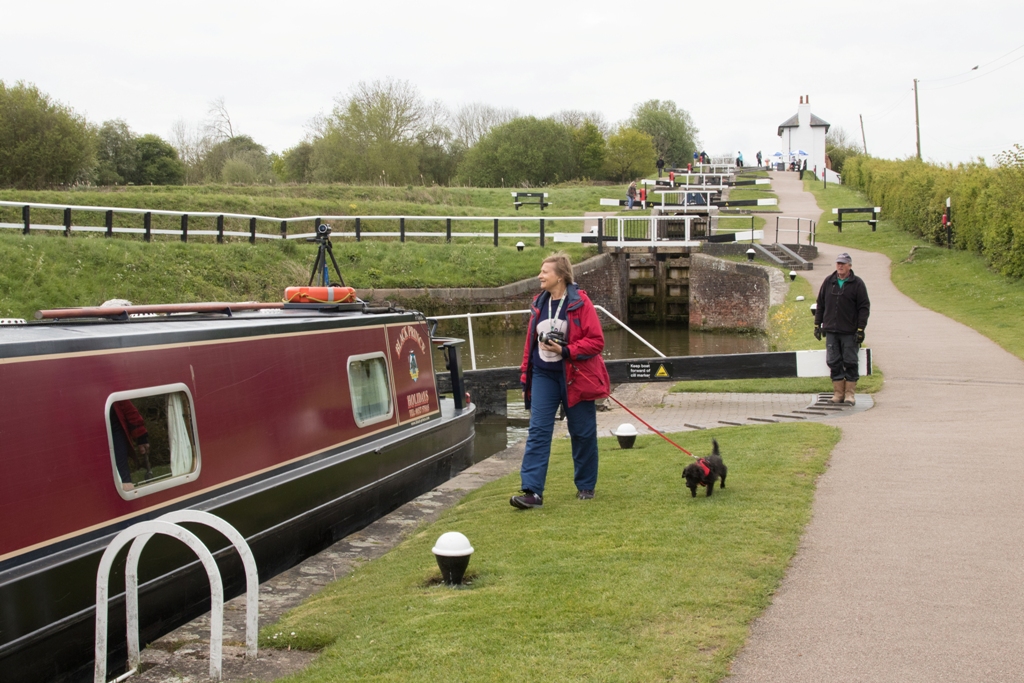 A busy time descending Foxton Staircase. As any canal buffs looking at this may already be aware, Foxton is in fact 2 x 5-rise staircases with a passing point between them, this being visible behind Denise and Roger.