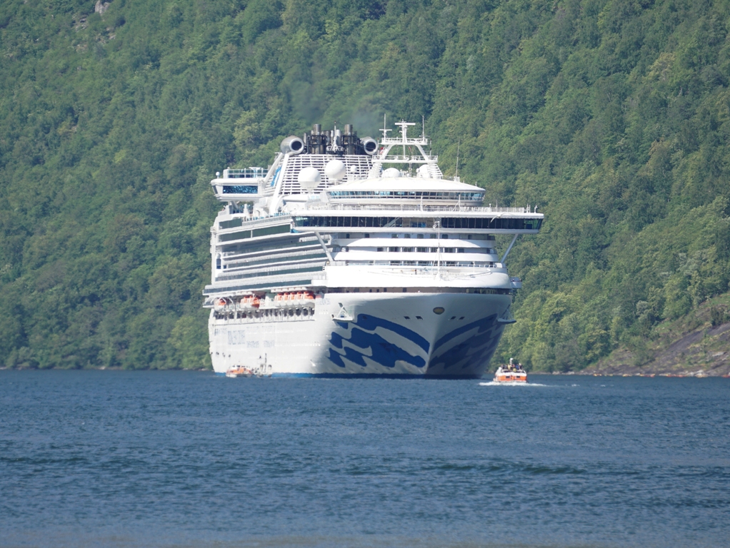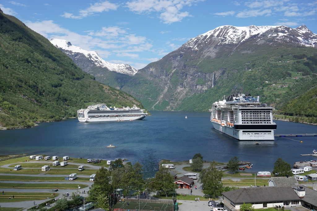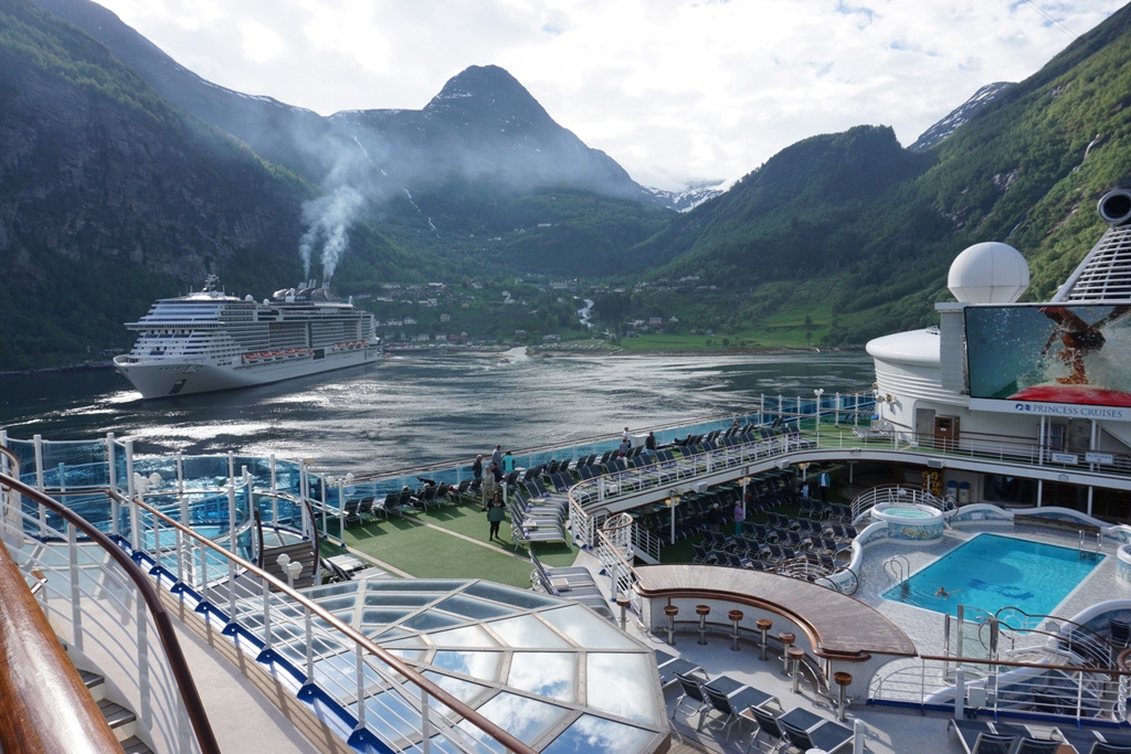 What a sight to wake up to ! Moored at the head of Geiranger Fjord, along with M.S.C. Mareviglia. It was a similar M.S.C. ship that subsequently 'went rogue' at Venice.
