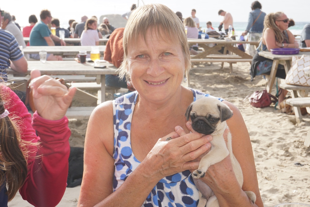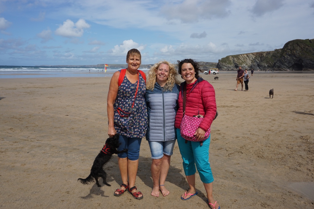 At the end of August we spent a fine late-summer weekend with Sarah Kaines (centre, a former colleague of Denise's) and her partner Simon, at their new home near Newquay. Also along on the trip were Denise's boss Carla (right) and her family, the newest edition to which can just be seen trying to peek out of Carla's doggie-bag.