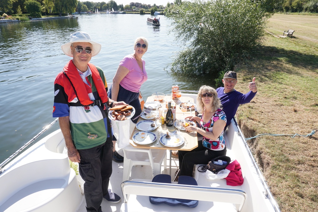All aboard for a grand weekend ! One advantage of a Monday-Monday hire is that you can get friends on board for an entire weekend. Diana, Tom and Fliss joined us on the Friday evening at Maidenhead, this shot being taken during our breakfast stop at Cookham the following morning.