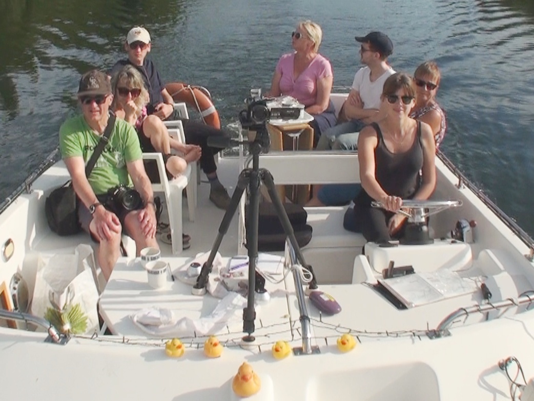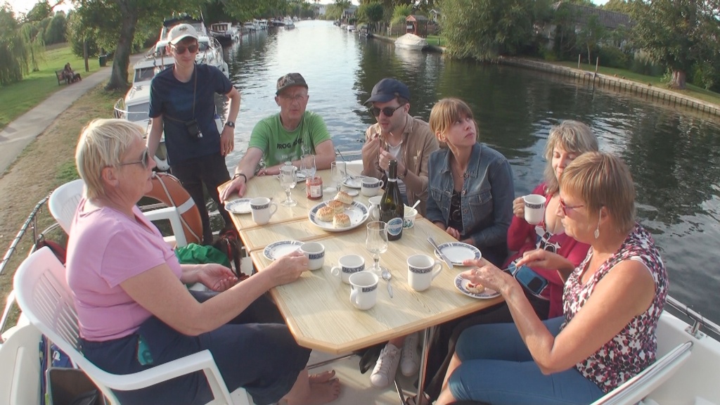 ....until, that is, five became eight, as nephew Ed (at the back on the left), niece Lottie (steering) and her partner Guy (back right) joined us for the Saturday afternoon, as we cruised from Marlow to Henley.